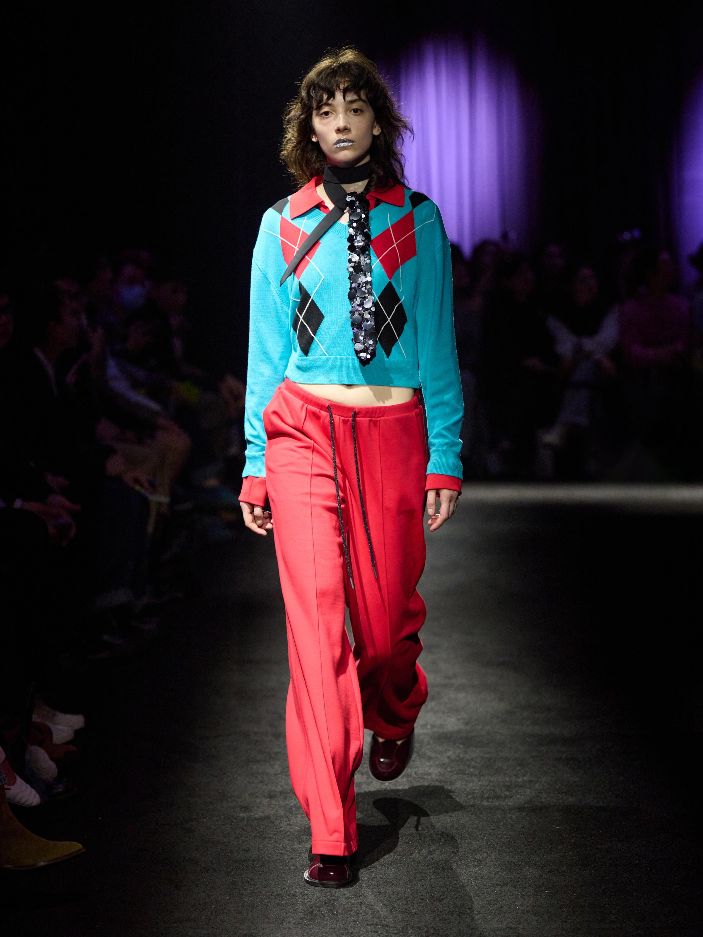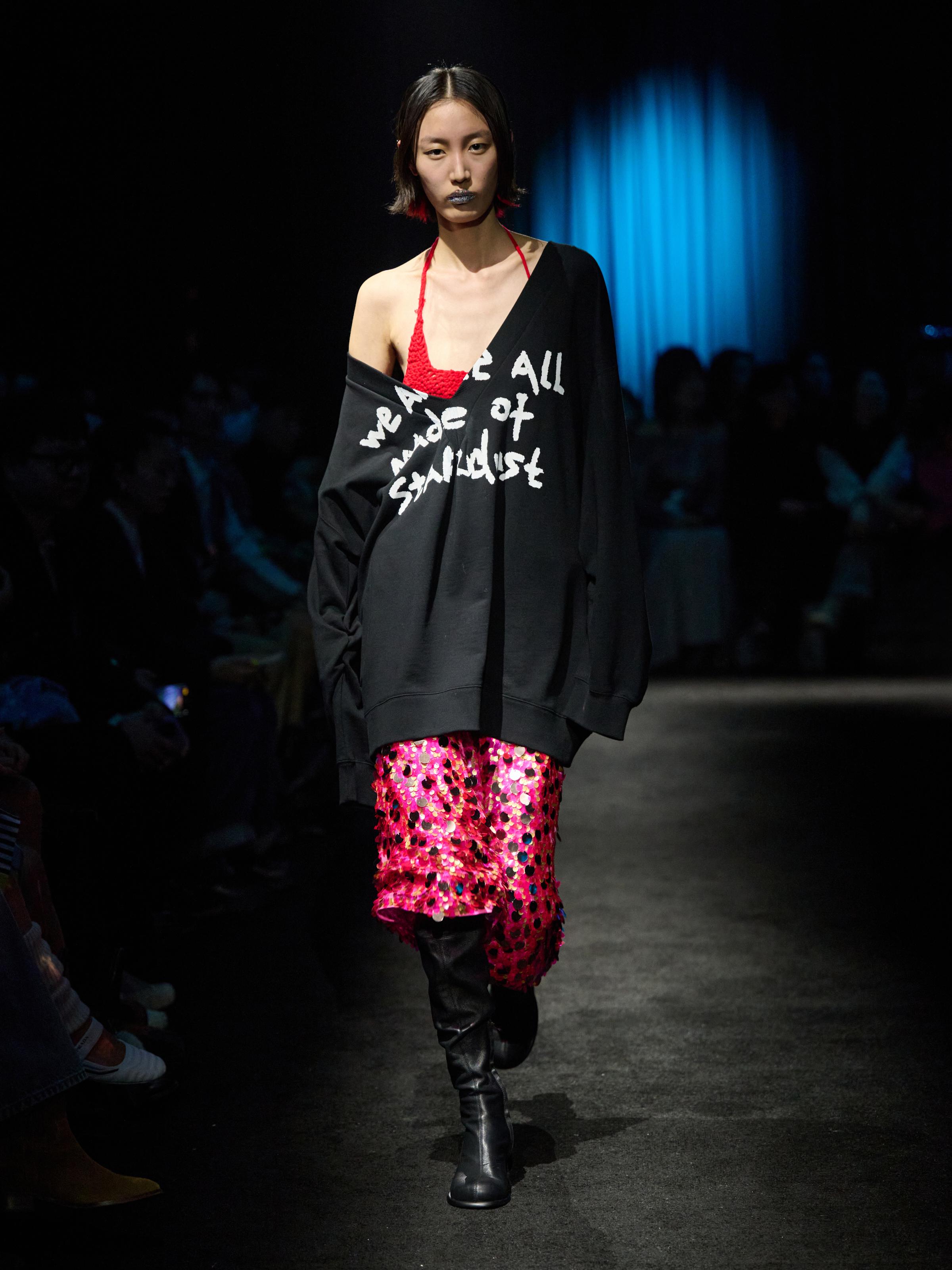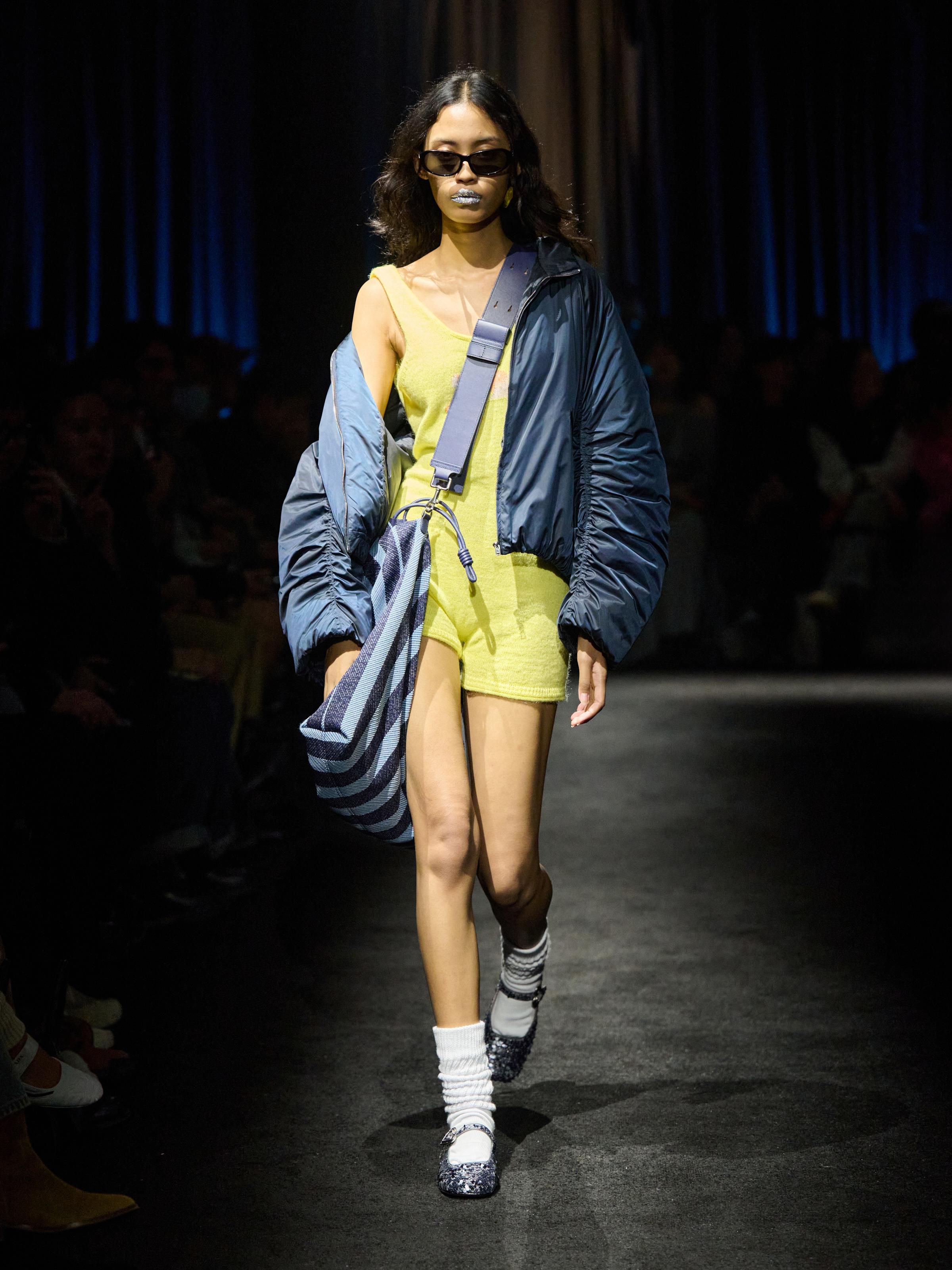 Short Sentence 2024秋冬系列以“Friends and Strangers”为名,灵感来自现居住于纽约的当代艺术家Katherine Bradford。她以轻松的绘画手法表达自我,几乎没有勾画面孔的人物形象,四四方方的身体和笨拙的手臂,在想象力的指引下任由潜意识挥洒颜料创作,调和出不被定义的色彩。艺术家的很多创作围绕人、海洋和星空元素展开,表面的轻松和快乐之下,自我沉浸的内心世界逐渐浮现展开。这种幽默而反叛的精神一直在她的人生选择中,也振奋着Short Sentence想以服装为载体表达同样的故事。