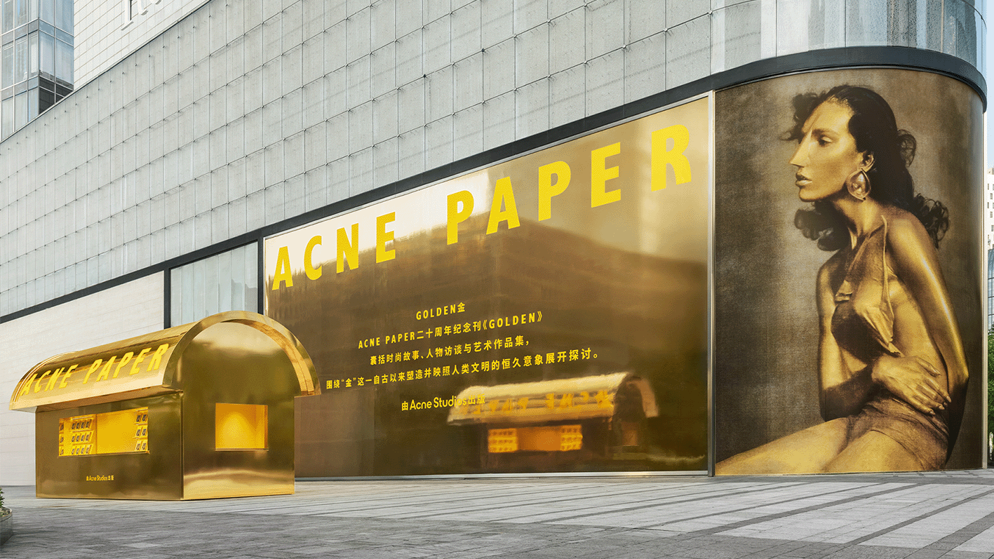 6月14日至6月22日,Acne Studios于上海芮欧达利钟广场特别呈现限时金色书报亭,为庆祝Acne Paper创刊二十周年。