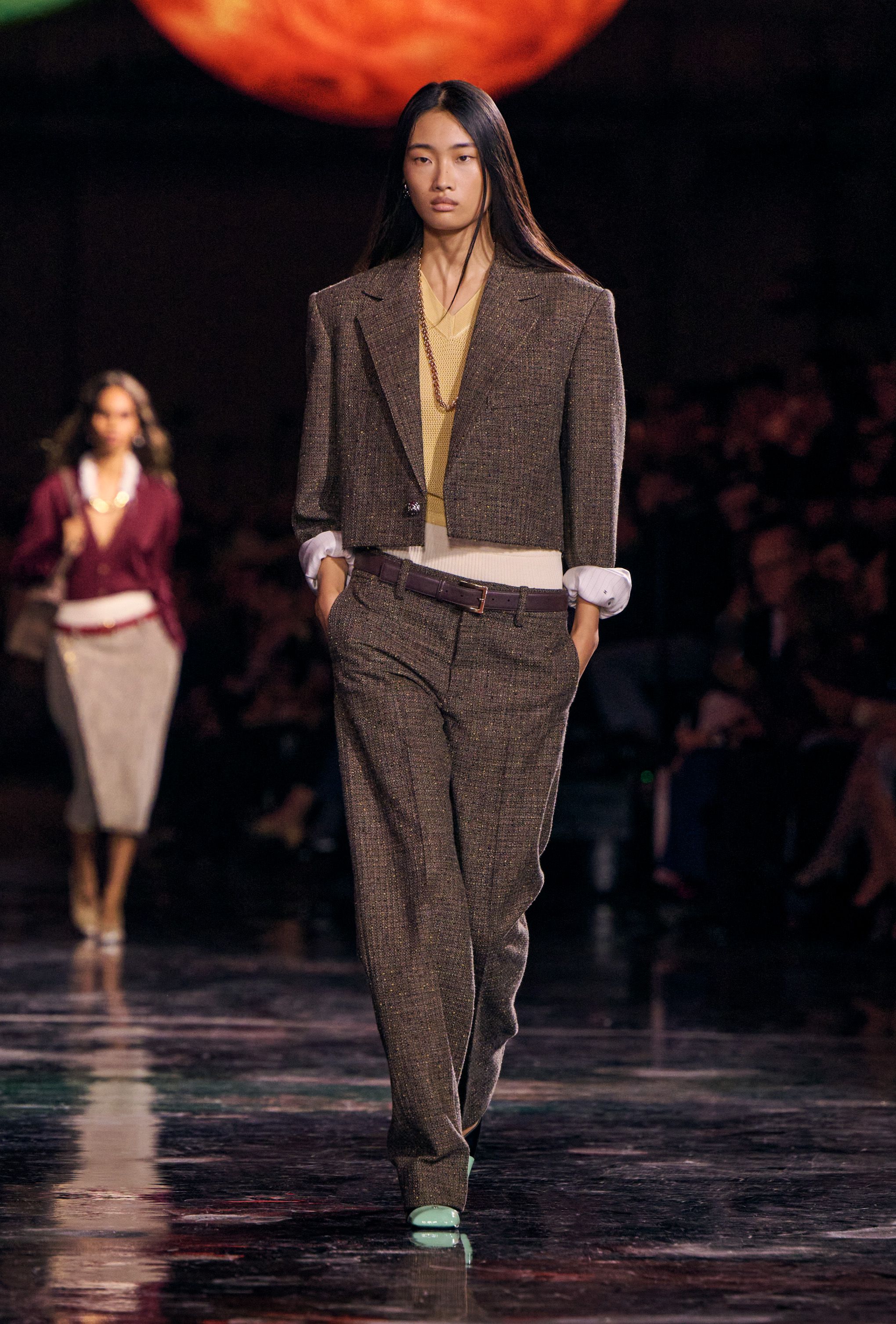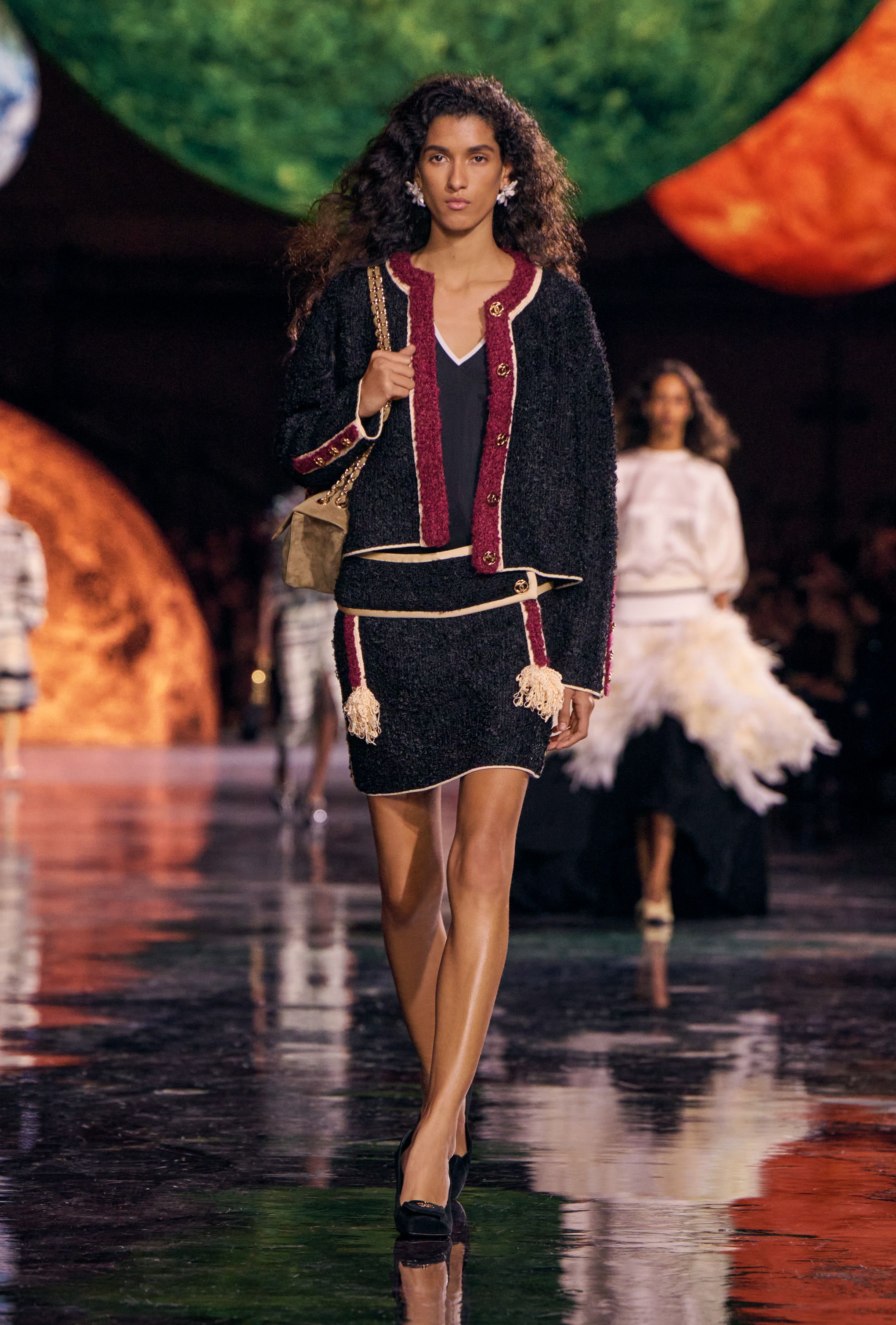本次秀场空间中,Matthieu Blazy罕见地借用了香奈儿女士童年时期鲜为人知的星空元素,营造出宛如星际漫游的沉浸式体验。模特在星光点缀的T台上行进,面料的飘逸、剪裁的利落与流动的光影交织,使整场秀宛如穿越时间与空间的旅程,随之开启了一段与品牌创始人Gabrielle Chanel女士之间的徐徐对话。<