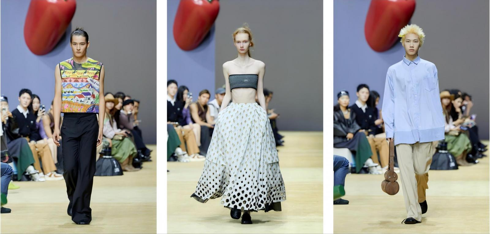 秀场构建了一段奇幻叙事:“一座天外来物莫名降落在高楼耸立的城市上空,恰似一片超体培育的世外桃源。村屋,花田,巨大瓜果,天鹅和奔跑的人群不成比例,飞艇盘旋于高空,拔地而起的巨型辣椒树如有神力般庇护着笼罩的一切。刹那间城市高楼,大树,村屋,以及田野中的一切混乱交错,这天花乱坠的荒谬世界看似惊险四起,却又欣欣向荣,热烈和谐。”