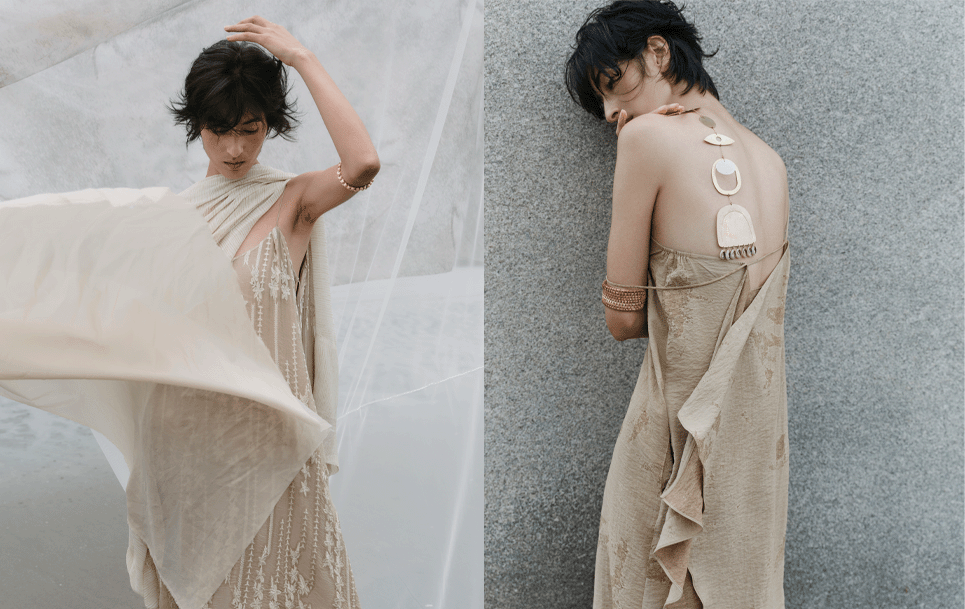 本季主题“失落的图景”以广西北部湾滩涂的生态印迹为灵感,延续品牌对自然生命力的持续关注。品牌主理人陈丹琪曾随“美境自然”团队深入滩涂湿地进行科考与影像记录,将滩涂间的自然痕迹与光影变幻转译为印花与面料肌理,使服装成为自然记忆的载体。