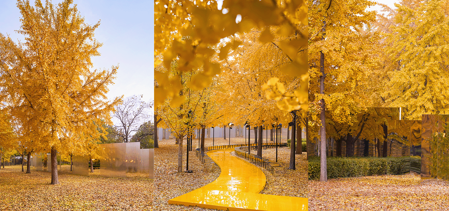秀场空间以银杏金黄为主调,镜面装置与蜿蜒的动线共同构成流动的视觉体验,仿佛时装与自然在此交汇。核心材质——羊绒以柔韧的密度和天然的属性,传递出具有当下时代气质的经典风格的独有温度,是品牌与都市生活构建的温和而有力的精神内核。
