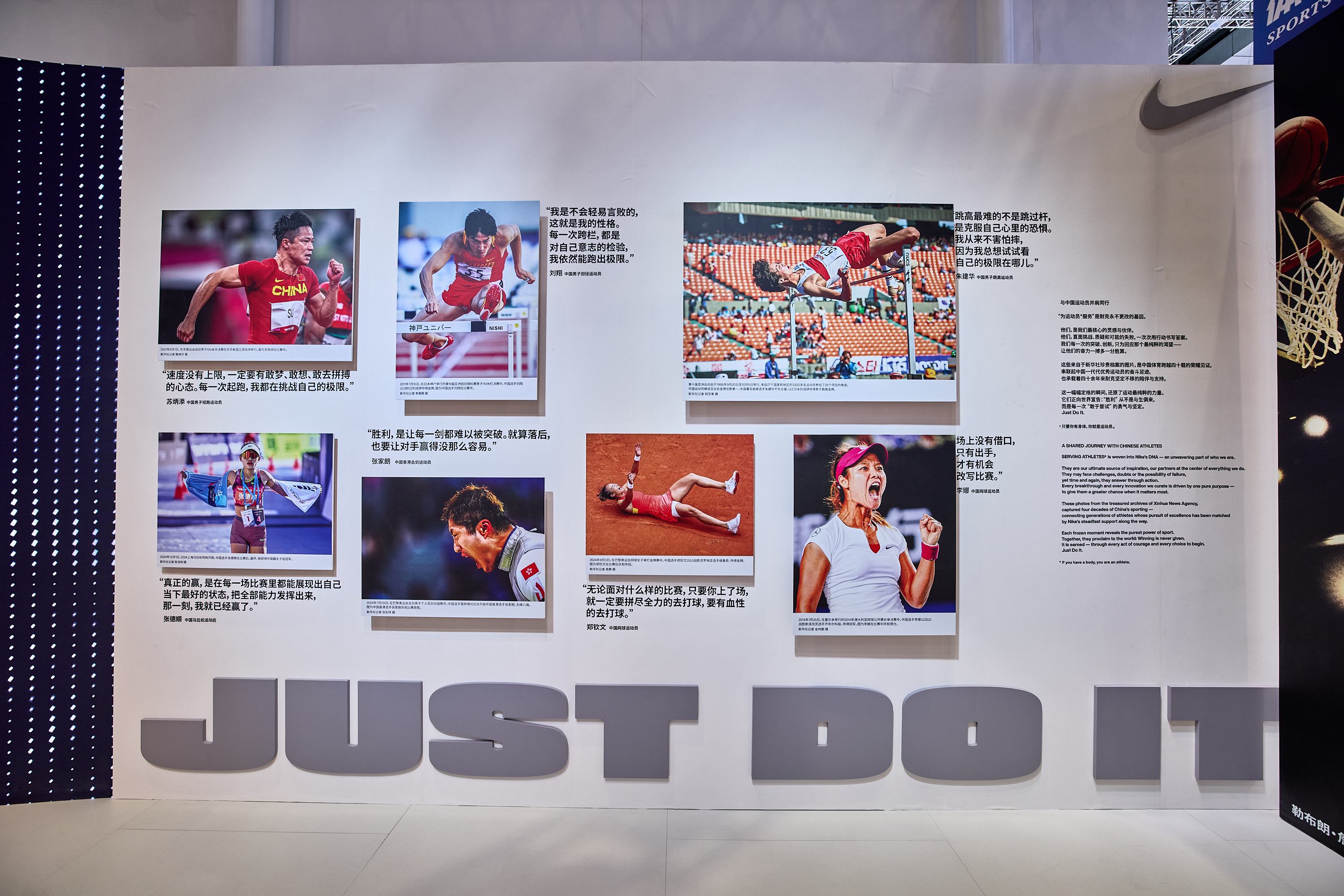 展台内,耐克以“胜利”为主题,让胜利女神塑像和展示中国运动员荣耀瞬间的照片墙交相辉映,用充满情感力量的方式诠释 “Just Do It”的运动精神。那些来自中国顶尖运动员们的真诚且激昂的语句,发射出振奋人心的力量。