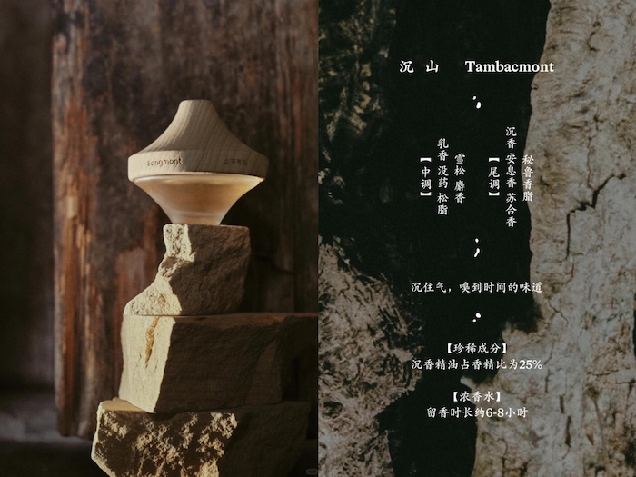此次首发香水“沉山”定价1280元/30ml,被描述为“不香的香”。山下有松特别邀请获得诸多大奖的本土独立调香师Yili进行合作,它的配方中精油占比为25%,强调沉静、空间感的东方意境。为了它的发布,擅长情绪营销的山下有松,特别制作了一支以《沉住气,香自来》为名的TVC,影片讲述了黎族人与沉香的世代关系、串联寻香过程,试图用文化链条为产品注入情绪深度。
