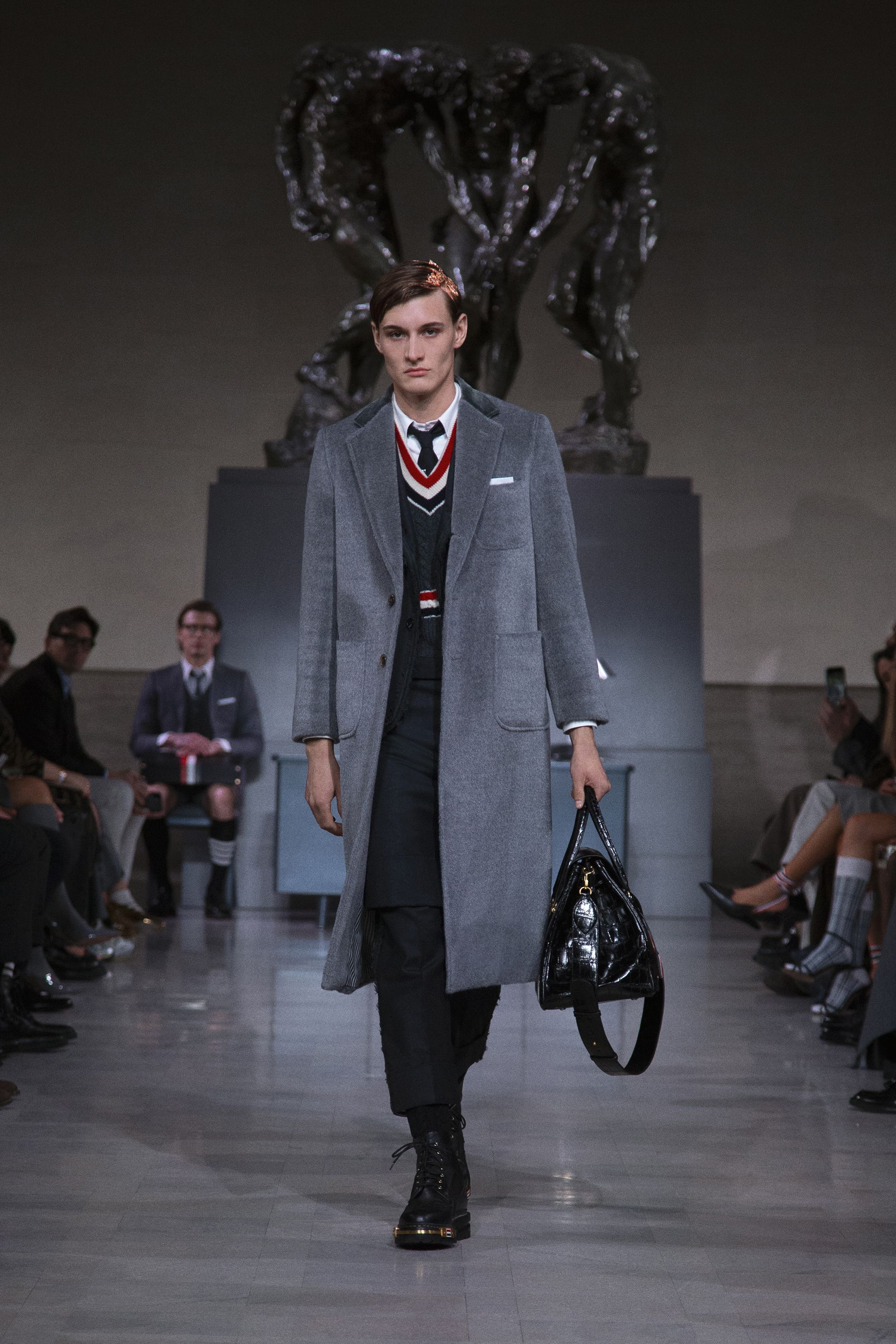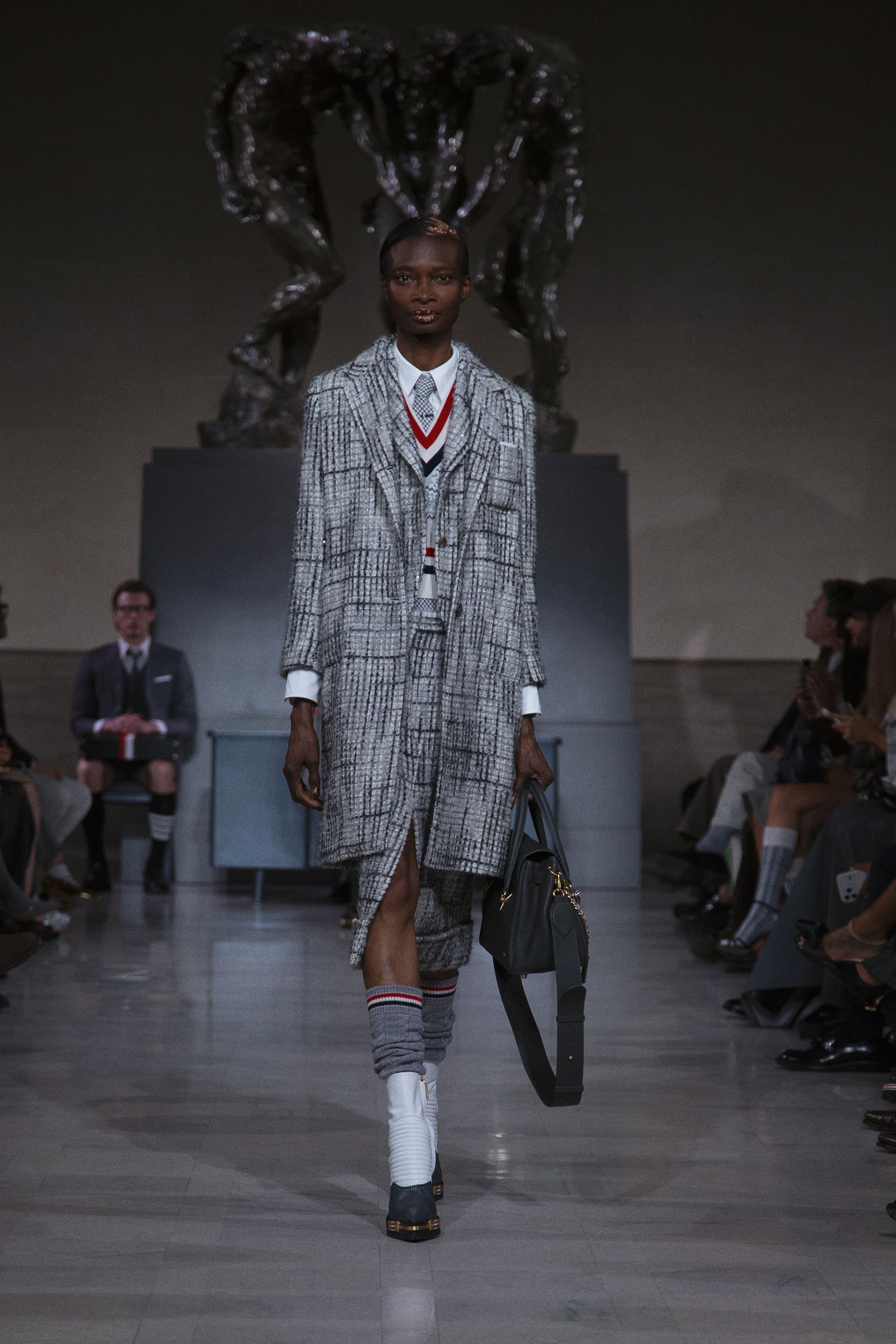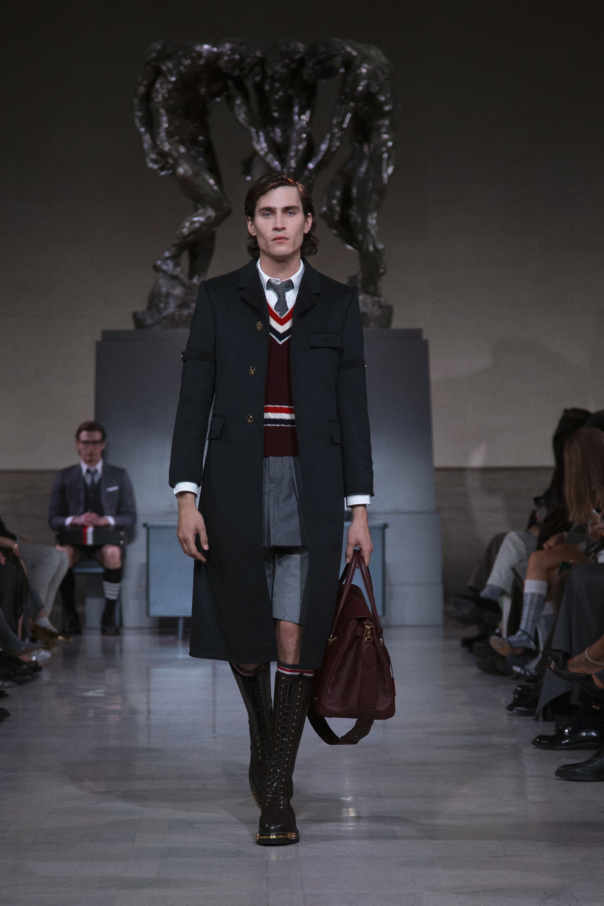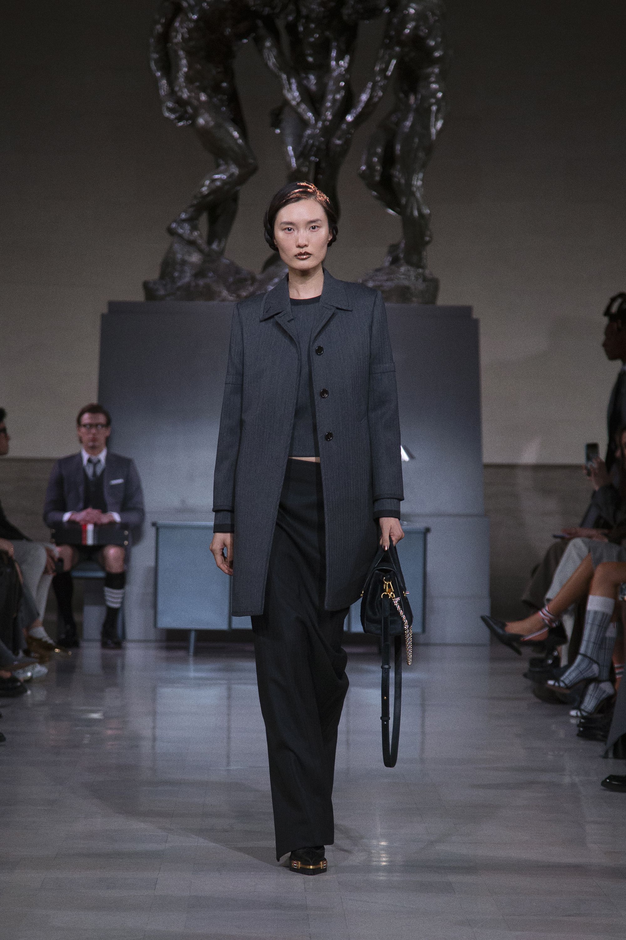 艾美奖获奖演员Yahya Abdul-Mateen II以低沉的旁白开启整场叙事。在罗丹雕塑的凝视之下,秀场并未急于张扬,而是以一种克制的节奏缓缓推进。青铜的重量与灰色的秩序交织,让这场发布更像是一场关于信念与结构的思考。