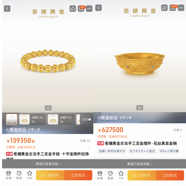 老铺黄金天猫旗舰店首页显示:10万元以上的黄金手串、17万元的黄金貔貅、价值30多万元的黄金蟾蜍,甚至价值逾60万元的大型摆件等高价产品,在开售不足十分钟即告售罄或下架。