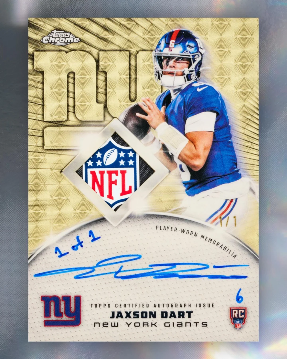 随着合作达成,2025-26赛季 Topps Chrome橄榄球系列将作为此次合作的重磅首发产品,于4月15日正式上市。该系列不仅是Topps Chrome产品线在NFL领域的荣耀回归,更带来了极具创新的两项收藏单品:全球唯一(1/1)的Topps新秀PREM1ERE实物签名卡,以及全球唯一(1/1)的NFL荣誉Gold Shield签名卡。
