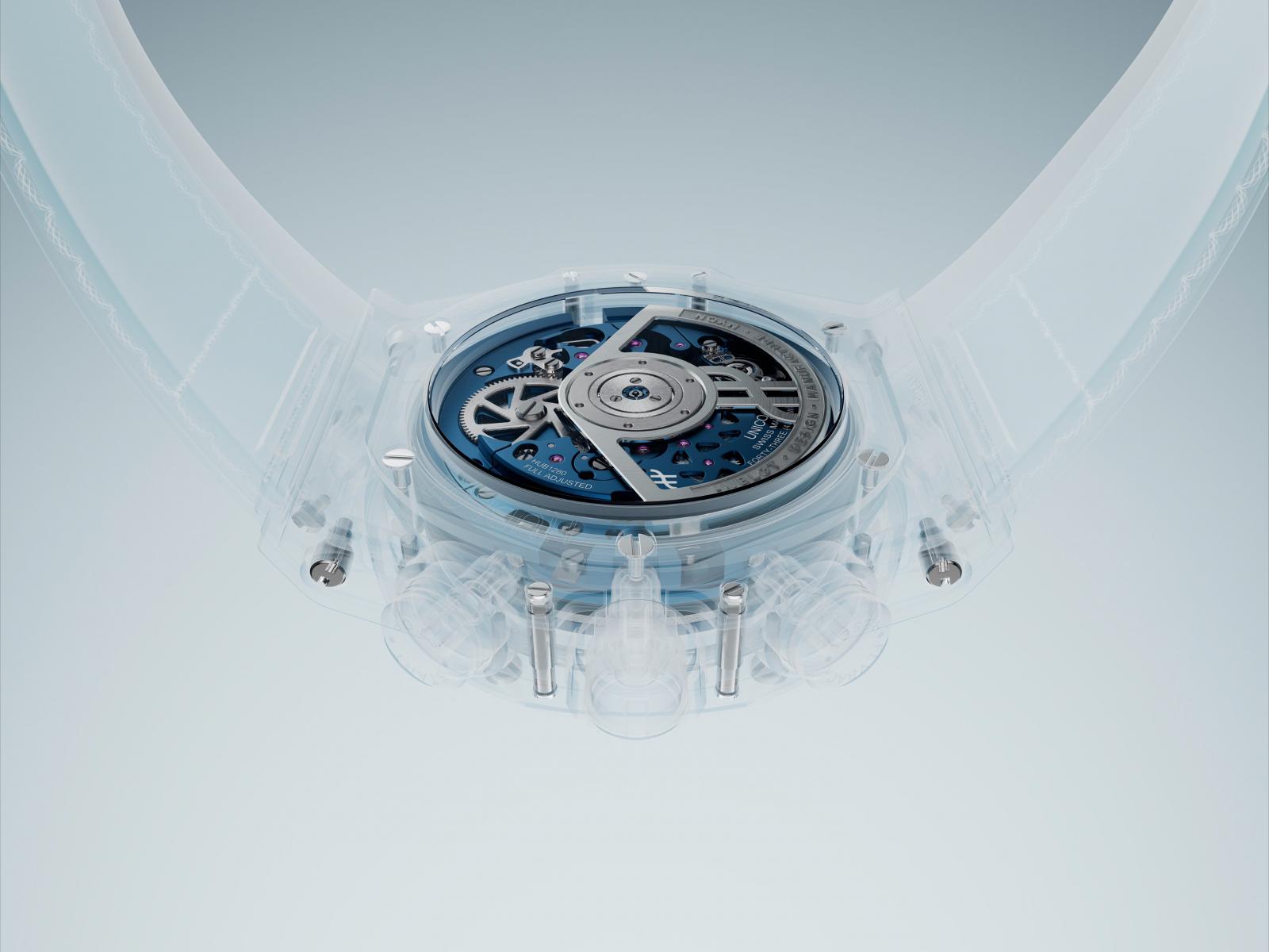 作为此次发布的技术核心,Big Bang Reloaded腕表以44毫米表壳为载体,对经典Big Bang结构进行全面重构。双层表圈强化了材质之间的对比与层次,镂空表盘则将Unico机芯推至视觉中心。6点钟位置的导柱轮与8点钟位置的双摆动离合结构清晰可见,配合飞返计时功能,使计时逻辑不再隐匿于机芯内部,而是转化为可被读取的机械语言。