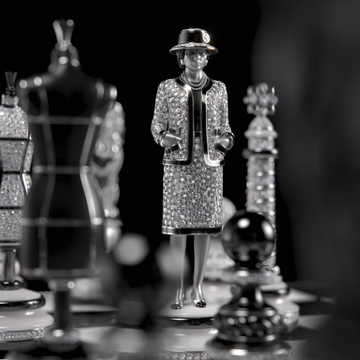 在这一系列中,嘉柏丽尔·香奈儿化身棋局中的“后”,成为掌控规则与节奏的核心角色。棋盘、棋子与时计不再彼此分离,而是共同构成一个关于时间的艺术系统:时间被隐藏、被佩戴、也被重新定义。