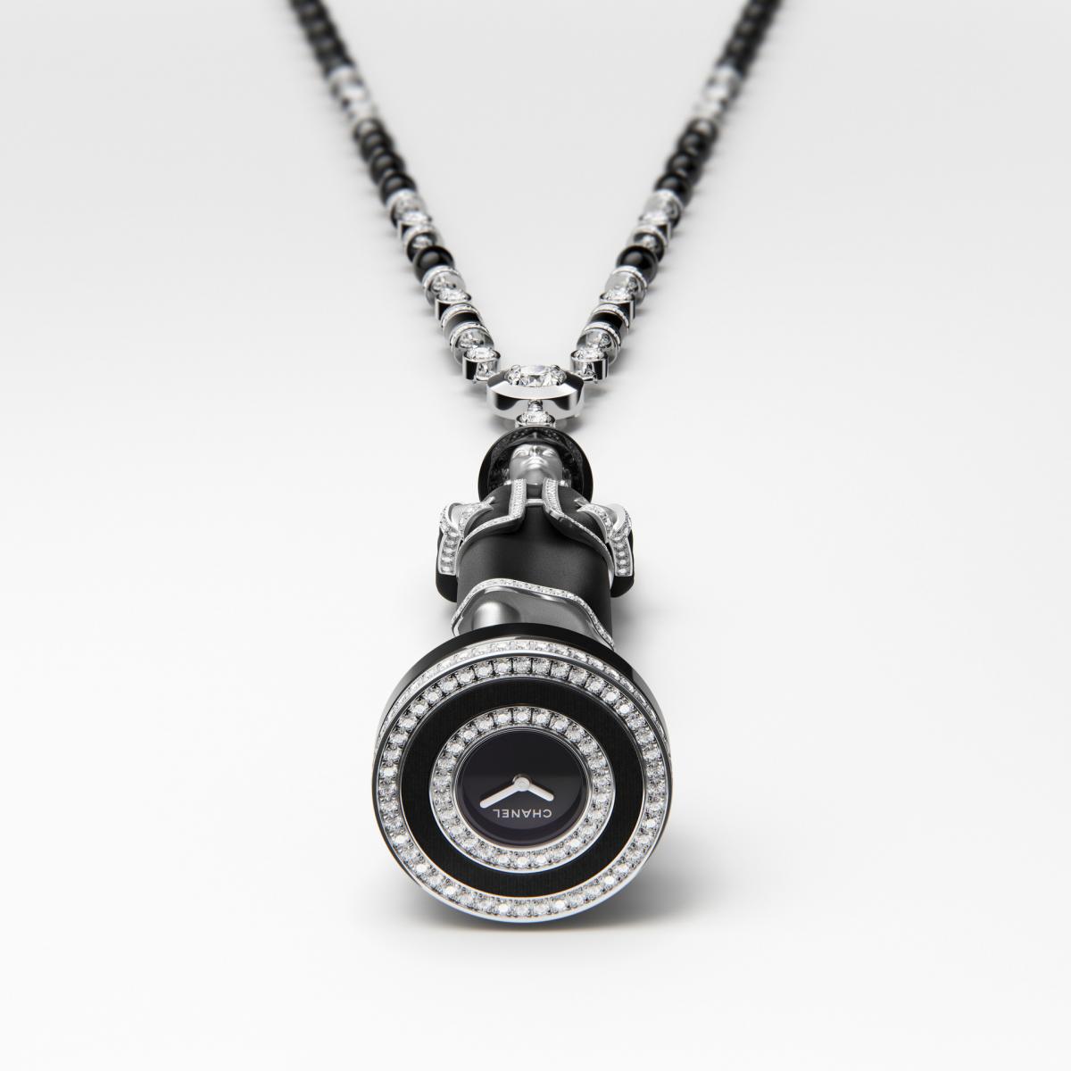 代表性作品THE CHESSBOARD以棋盘为载体,将制表、珠宝与雕塑语言融为一体。黑白棋子由精密陶瓷、白18K金与钻石打造,既有狮子、芳登广场圆柱等品牌符号,也有香奈儿女士的形象化身“后”。两枚“后”不仅象征权力,也内嵌时计功能,可转化为项链佩戴,使时间从腕间延伸至身体之上。